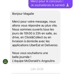I had the opportunity to dine at McDonald's® Angoulins recently, and I was impressed by the quality of the food and the prompt service. The burgers were hot and fresh, the fries were perfectly seasoned, and the drinks were ice-cold. Overall, my experience at McDonald's® Angoulins was delightful, and I would highly recommend it to anyone craving a quick and satisfying meal.